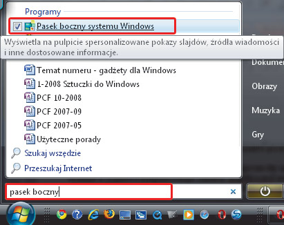 Zakładamy, że pasek boczny masz już uruchomiony w swoim systemie Windows Vista. Jeżeli tak nie jest, w polu wyszukiwania menu Start wpisz pasek boczny i kliknij element Pasek boczny systemu Windows, który wyświetli się w górnej części menu Start.