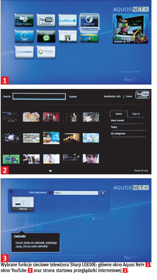 Jeśli chodzi o funkcje związane z internetem, większy ich zestaw oferuje sharp – daje dostęp do YouTube, Daily Motion, Picasa, MeteoConsult i innych serwisów oraz gier. Można jednak odnieść wrażenie, szczególnie w przypadku korzystania z tych zaawansowanych dodatków, że oprogramowanie jest zbyt „ciężkie” jak na możliwości urządzenia, gdyż menu działa niezbyt płynnie.