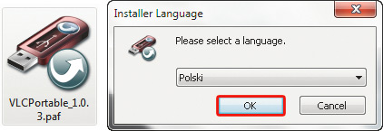 Kliknij dwukrotnie ikonę VLCPortable_1.0.3.paf. Potwierdź ewentualne otwarcie pliku, jeżeli na ekranie pojawi się okno z ostrzeżeniem o zabezpieczeniach. Następnie wybierz Polski z listy dostępnych języków i kliknij OK.