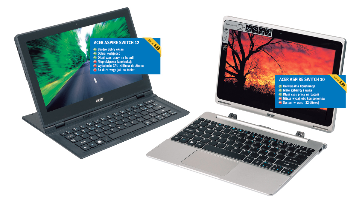 Mimo należenia do tej samej linii produktowej Aspire Switch 12 różni się od modelu hybrydowego, który w naszym teście występuje w postaci Aspire Switch 10. Jest większy, ma ciekawą konstrukcję, wyższe parametry, a także wyższą cenę. Kosztuje około 2500 zł, podczas gdy prostszy model można kupić za około 1300 zł. Z pewnością nie należy traktować tych komputerów jako sprzętu tej samej klasy.