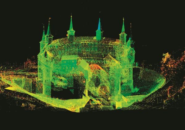Jak tłumaczył mgr inż. Kubiś, nałożone na siebie chmury punktów zróżnicowanych kolorystycznie z naziemnego lasera 3D dają informacje o albedo, czyli sile odbicia wiązki lasera od powierzchni skanowanego obiektu. Na ten współczynnik składa się kilka cech, m.in. odległości, czy rodzaj powierzchni skanowanej (B). Często powstaje szum pomiarowy, który jest marginesem błędu. Takie zanieczyszczenia usuwa się ręcznie oraz za pomocą specjalnych algorytmów.