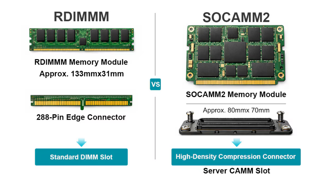 AMD dostrzegło potencjał w przeniesieniu tej technologii do szaf serwerowych. Głównym wyzwaniem był jednak fakt, że pamięci LPDDR są zazwyczaj lutowane bezpośrednio na płytach głównych, co w świecie serwerów – wymagającym modularności, łatwości serwisowania i elastyczności rozbudowy – było do tej pory nie do zaakceptowania. Rozwiązaniem okazał się nowo zatwierdzony przez JEDEC format SOCAMM2 (Small Outline Compression Attached Memory Module).
