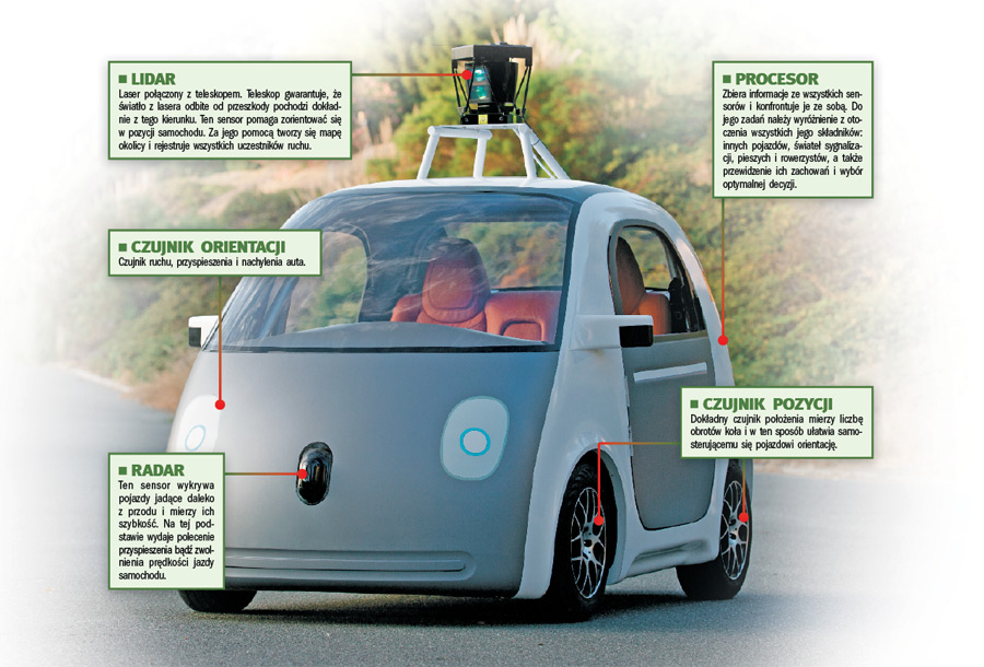 Samoprowadzące się auto ma kilka czujników. Laser połączony z teleskopem (to urządzenie nazywa się lidar) zastępuje oczy kierowcy. Dane z lidaru służą do sporządzenia mapy okolicy z udziałem wszystkich uczestników ruchu. Kolejnym sensorem jest GPS, ale ze względu na swoją słabą dokładność służy tylko do określenia przybliżonego położenia pojazdu. Wbudowany radar wyszukuje samochody jadące z przodu, mierzy ich szybkość i pilnuje, żeby zwolnić albo przyspieszyć, stosownie do sytuacji na drodze. Dokładny przebieg mierzy licznik obrotów jednego z kół. Oprócz tych czujników jest jeszcze sensor orientacji. Wszystkie czujniki są podłączone do komputera.
