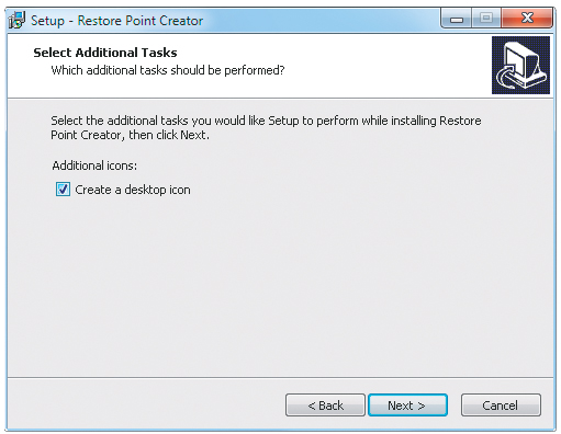 Przechodząc przez kolejne ekrany standardowego instalatora, zwróć uwagę na opcję tworzenia ikony programu na pulpicie. Domyślnie jest ona wyłączona. Warto jednak zadbać o jej aktywację. Wystarczy, że zaznaczysz pole Create a desktop icon, po czym naciśniesz przycisk Next. Dzięki temu po zakończeniu instalacji możesz od razu uruchomić program bezpośrednio z pulpitu, klikając ikonę Restore Point Creator.