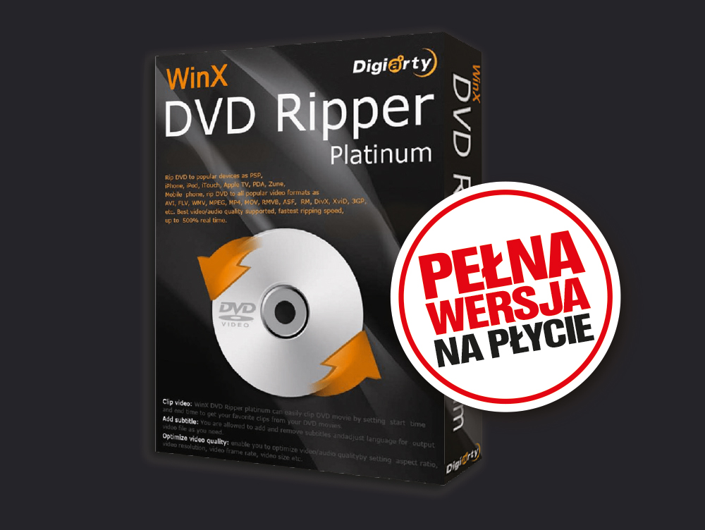 W tym miesiącu polecamy pełną wersję narzędzia dla kolekcjonerów filmów na płytach DVD. Aplikacja DVD Ripper Platinum skopiuje je z oryginalnych nośników i zapisze na dysku w postaci plików wideo. Do wyboru są różne tryby pracy: kopiowanie i konwersja filmu do jednego z obsługiwanych formatów, tworzenie obrazu krążka, tworzenie plików MPEG2 zawierających wszystkie klipy wideo, audio i napisy dialogowe, klonowanie lub wykonywanie kopii tylko wybranej zawartości. Ponadto aplikacja może dopasować parametry ścieżki wideo do urządzenia, na którym film ma być odtwarzany (do wyboru jest kilkaset profili). DVD Ripper obsługuje akcelerację sprzętową. Pozwala bardzo szybko kopiować filmy nawet na mniej wydajnych pecetach. Zachowane są przy tym maksymalna jakość wideo i preferowany rozmiar pliku wyjściowego.