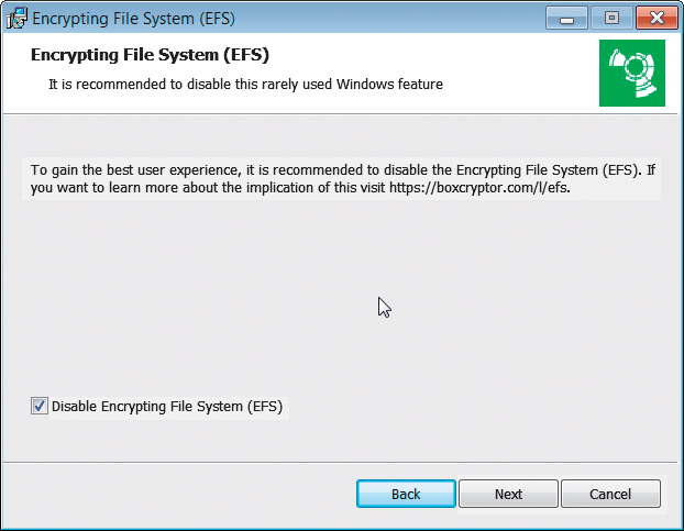 Plik instalacyjny najlepiej pobrać ze strony producenta. Podczas instalacji program ma domyślnie aktywowaną opcję Disable Encrypting File System, czyli szyfrowania wbudowanego w system plików NTFS. Ta funkcja jest dostępna tylko w profesjonalnych edycjach Windows (od wersji 2000), Pozostaw tę opcję bez zmian.