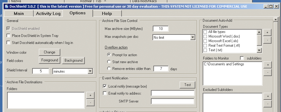 Według domyślnej konfiguracji program DocShield zapisuje wersję pliku co 5 minut. Aby zwiększyć częstotliwość zapisu, przejdź do zakładki Options, w sekcji General znajdź opcję Shield Interval i wpisz 1.