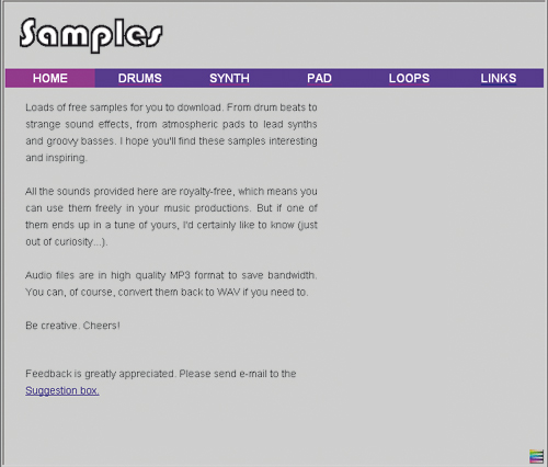 Świetna biblioteka dla początkującego muzyka szukającego prostych brzmień do swoich kompozycji. Jest tu kilka podstawowych kategorii: bębny (zestaw standardowy, bębny syntetyczne, brzmienia z legendarnego instrumentu Roland MC-303), syntezatory, brzmienia atmosferyczne, tzw. pady, oraz pętle instrumentalne, tzw. loopy, do zastosowania w kilku tempach. Wszystkie pliki są spakowane zipem, więc ich ściągnięcie trwa zaledwie chwilę, oraz co istotne, mają licencję typu royality free. Oznacza to, że nie trzeba płacić za pobieranie próbek, ale można je wykorzystywać tylko do niekomercyjnych projektów.