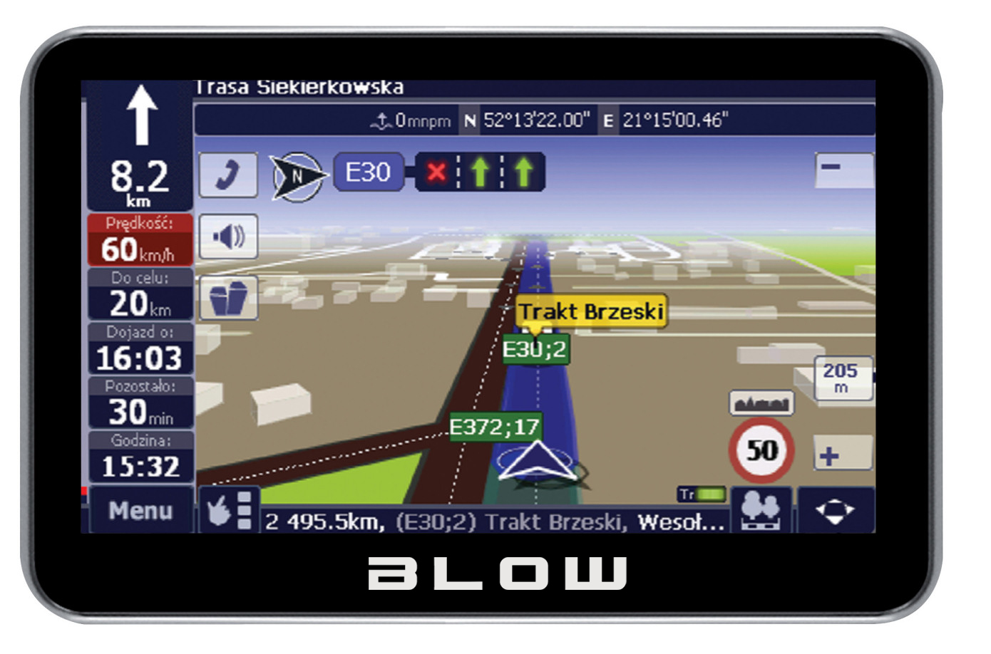 Urządzenie wykonano z materiałów zapewniających funkcjonalność, odporność i ciekawą stylistykę. Najnowsze algorytmy wyliczania pozycji pozwalają bardzo szybko i dokładnie określić położenie także w trudnych warunkach terenowych. Wbudowany moduł łączności Bluetooth pozwala nawigacji korzystać z łącza danych telefonów GSM w celu pobrania informacji o ruchu drogowym. Możliwość współpracy z serwerami ruchu Traffic systemów nawigacyjnych pozwala ocenić bieżącą sytuację drogową na ekranie nawigacji i automatycznie modyfikować trasę przejazdu, w zależności od bieżącej przepustowości dróg, blokad drogowych, itp. Dzięki temu, użytkownicy BLOW GPS43FBT mogą znacznie szybciej od pozostałych kierowców dotrzeć do celu podróży.