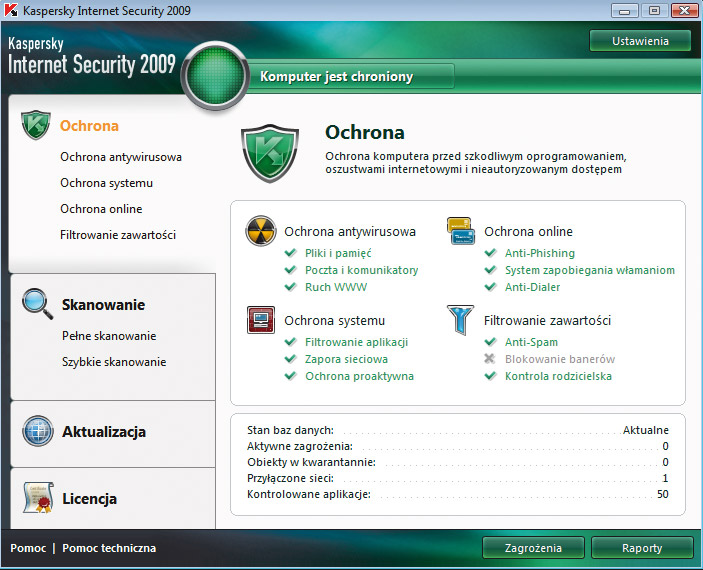 Instalacja programu jest prosta. Po niej uruchamiane są kolejno kreatory aktywacji i konfiguracji. Istotnym etapem instalacji jest wyrażenie przez użytkownika zgody na uczestnictwo w Kaspersky Security Network. KSN to centralnie zarządzana sieć komputerów użytkowników programu KIS 2009, dzięki której pojawienie się jakiegokolwiek nieznanego wcześniej zagrożenia na którymkolwiek z komputerów włączonych w KSN automatycznie oznacza aktywację ochrony dla wszystkich innych komputerów w sieci KSN. Brak w programie dodatkowych funkcji takich jak optymalizacja czy backup, ale nie są to funkcje związane z ochroną bezpośrednio. Znakomita szybkość.