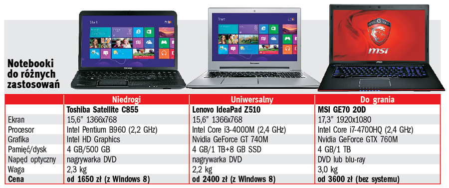 Od niego zależy, czy sprzęt będzie się nadawał do pracy stacjonarnej (15–17”) czy do wygodnego przenoszenia (12–14”). Do domowego komputera lepiej pasuje oczywiście większy ekran, a w tym segmencie popularne ekrany 15,6” ustępują obecnie większym, 17,3-calowym, które są niewiele droższe. Przykładowo, 15,6-calowy model z procesorem Core i3–4000M i systemem Windows można znaleźć za 2000 zł, a odpowiednik z większym wyświetlaczem kosztuje 2300 zł. Warto się na to zdecydować, bo przekątna to niejedyna jego zaleta. Zamiast rozdzielczości HD (1366×768) masz do dyspozycji HD+ (1600×900), więc na ekranie mieści się znacznie więcej informacji, praca jest bardziej komfortowa.