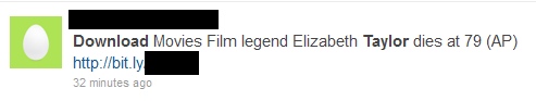 Jeden z analityków zagrożeń pracujących w Kaspersky Lab natrafił na Twitterze na wiadomość o następującej treści: „Download Movies Film legend Elizabeth Taylor dies at 79 (AP)”. Wiadomość zawierała także odsyłacz skrócony przy użyciu usługi bi.ly.