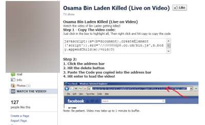 Cyberprzestępcy nie marnują czasu – już wykorzystują olbrzymie zainteresowanie informacją o śmierci Osamy Bin Ladena i stosują na Facebooku swoje stare, sprawdzone sztuczki. Łańcuch infekcji rozpoczyna się od wiadomości od znajomego na Facebooku. Komunikat brzmi: „obejrzyj wideo pokazujące śmierć Osamy Bin Ladena”, pod spodem widnieje link. Wiadomość rozpoczyna się od prawdziwego imienia adresata, co dodaje jej wiarygodności.