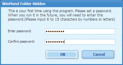 Podczas pierwszego uruchomienia programu WinMend Folder Hidden zobaczysz na ekranie okno dialogowe WinMend Folder Hidden. Wpisz w nim, w polach Enter password oraz Confirm password, hasło chroniące dostęp do danych, które wkrótce ukryjesz. Po wpisaniu w oba pola identycznego hasła kliknij OK.