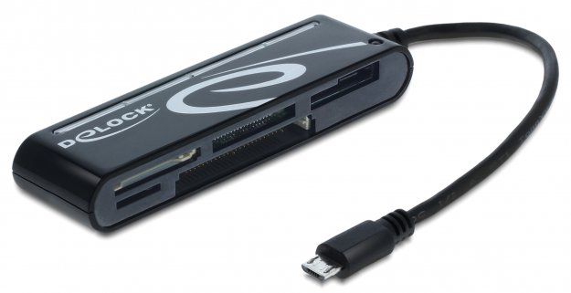 Czytnik kart firmy Delock umożliwia odczyt i zapis danych na kartach pamięci przez port micro USB OTG tabletu lub smartfona. Z drugiej strony urządzenia użytkownik ma do dyspozycji kilka portów na popularne karty typu flash.
