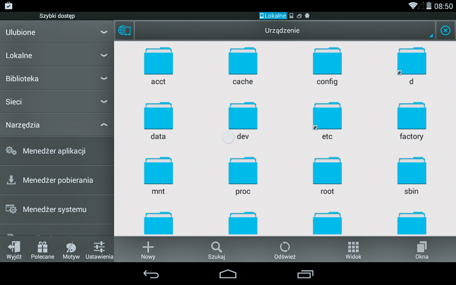 System Android nie ma własnej przeglądarki plików, więc należy posiłkować się zewnętrznym programem. Menedżerów plików jest w Google Play wiele – my polecamy ES File Explorer. Program pozwala na łatwe kopiowanie i kasowanie plików i katalogów. Możesz korzystać także z zasobów dysków sieciowych oraz dodawać dyski działające w chmurze. Pamiętaj, że jeżeli w tablecie umieszczona jest karta micro-SD, to pamięć karty oraz pamięć tabletu widoczne są w menedżerze jako dwa osobne nośniki danych.