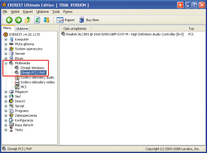 Jeśli masz problem z określeniem, jaki układ dźwiękowy znajduje się w twoim komputerze, możesz użyć np. programu Everest. Rozwiń gałąź Multimedia, kliknij Dźwięk PCI/PnP i w prawej części okna programu sprawdź nazwę układu dźwiękowego.