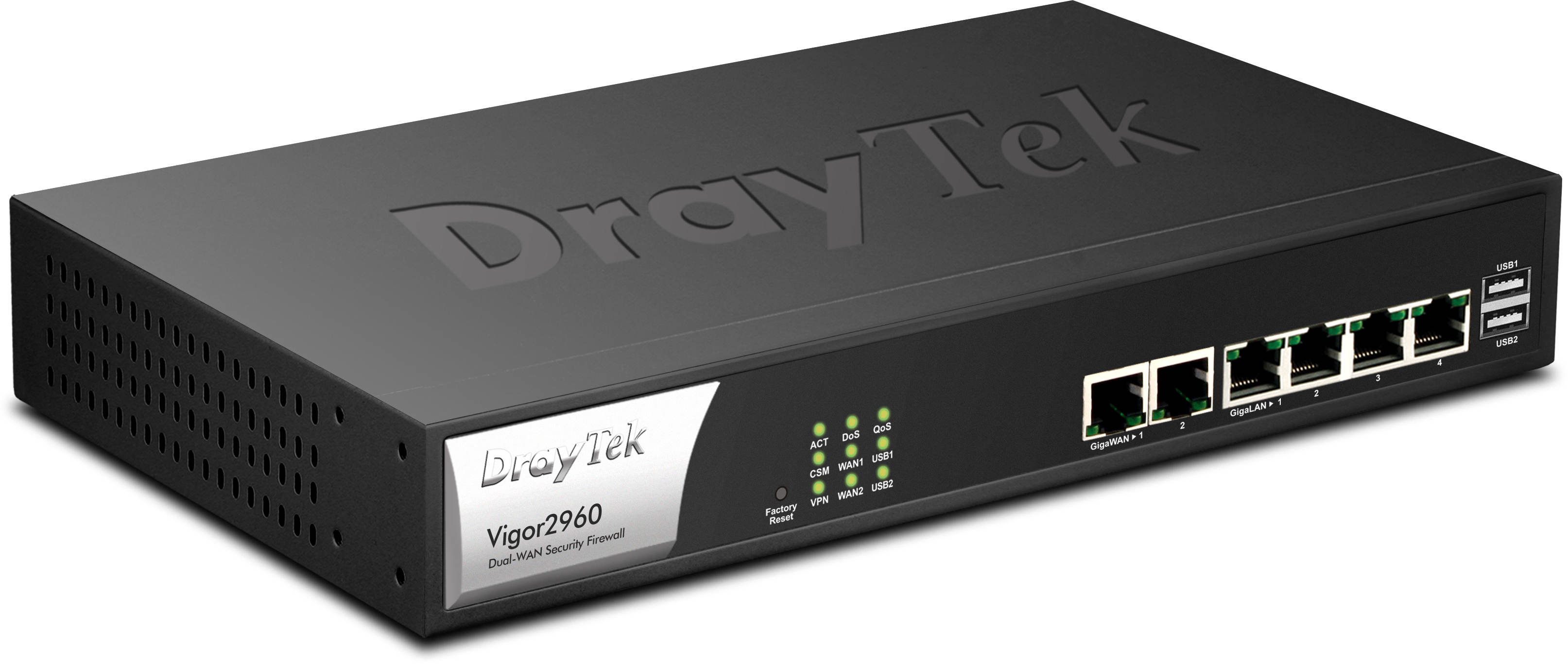 Vigor 2960 wyposażono w podwójny interfejs Gigabit WAN, co umożliwia korzystanie z dostępu do internetu od dwóch dostawców jednocześnie. Urządzenie oferuje też 4 Gigabitowe porty LAN, z funkcją VLAN tagging. Oznacza to, że router potrafi odizolować i podłączyć do internetu do 20 prywatnych podsieci IP. Użyteczną funkcją jest również narzędzie Bandwidth Management, które pozwala kontrolować łącze internetowe i dostosowywać prędkość transferu dla każdego użytkownika w sieci, eliminując problem obciążenia sieci przez użytkowników notorycznie ściągających olbrzymie ilości danych. Dodatkowo do routera można podłączyć serwer z bezpłatnym oprogramowaniem Draytek Smart Monitor Analyzer, które umożliwia monitorowanie ruchu w sieci.