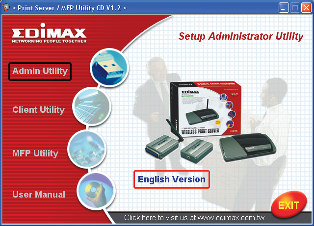 Włóż do napędu optycznego płytę CD dostarczoną z serwerem druku. Gdy pojawi się interfejs, kliknij w nim Admin Utility, a następnie English Version.