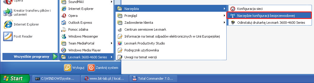 W menu Start odszukaj i uruchom program Lexmarka Narządzie konfiguracji bezprzewodowej.