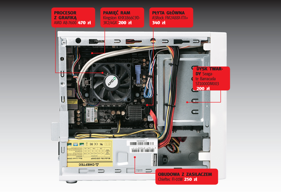 W roli procesora proponujemy wykorzystanie układu AMD A8-7600, który ma wszystkie najnowsze funkcje, w tym grafikę Radeon R7 korzystającą z architektury GCN, oraz wsparcie dla nowej technologii przetwarzania dźwięku TrueAudio. Ten model procesora jest interesujący również z innego powodu – użytkownik może zdecydować, czy ma to być standardowy procesor 65-watowy czy energooszczędny 45-watowy (pracuje wtedy wolniej, ale komputer jest cichszy i bardziej energooszczędny).