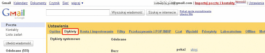 Zaloguj się do skrzynki pocztowej. Aby stworzyć nową etykietę, kliknij odnośnik Ustawienia. W wywołanym panelu konfiguracji ustawień przejdź do sekcji Etykiety. Na ekranie zobaczysz okno do zarządzania etykietami, które zostały stworzone przez Gmail.