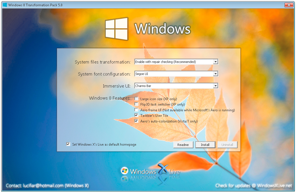 Jeżeli korzystasz z Visty lub „Siódemki”, a chcesz jak najwierniej upodobnić swój system do nadchodzącego Windows 8, zaznacz pole Aero's auto-colorization funkcji służącej do automatycznej koloryzacji okien. Na zakończenie odznacz jeszcze opcję: Set Windows X's Live as default homepage, dzięki czemu uchronisz się przed automatyczną zamianą ustawionej w przeglądarce strony domowej na witrynę Windows X’s Live, należącą do twórców programu. Kliknięcie przycisku Install zainicjuje instalację zgodną ze wstępnymi ustawieniami programu.