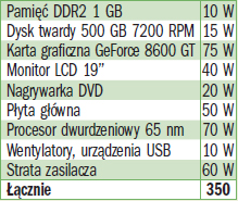 Cały zestaw komputerowy średniej klasy pochłania w trakcie wytężonej pracy nawet 350 W energii. Najbardziej prądożerne elementy to karta graficzna i procesor. Duża część pobieranej przez peceta energii jest marnotrawiona przez zasilacz, którego sprawność pracy wynosi około 80 proc.