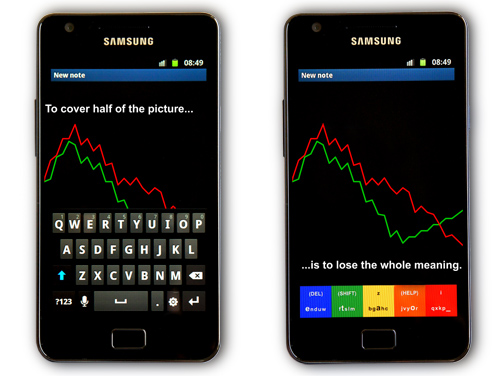 System przeznaczony jest dla urządzeń z ekranami dotykowymi i opiera się na oryginalnym pomyśle: zamiast przydzielonego osobnego klawisza, każda litera, znak i komenda mają przypisaną kombinację kolorów. Takie rozwiązanie gwarantuje nie tylko więcej miejsca na ekranie telefonu. Klawiatura ETAOI jest również niezwykle szybka i dokładna, a telefon staje się łatwiejszy w obsłudze.