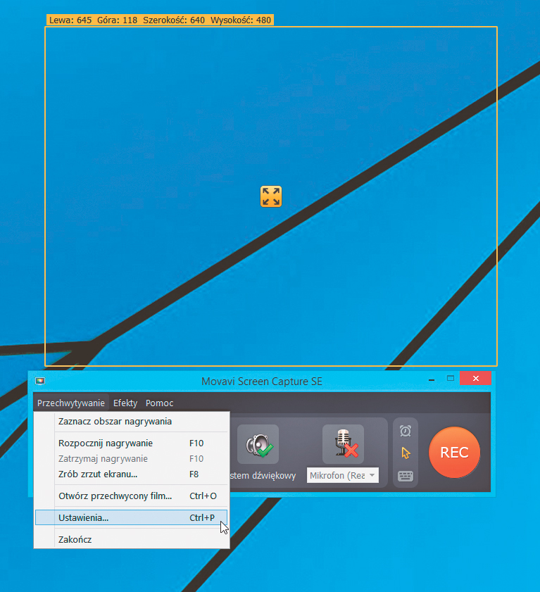 Możesz również wybrać własną rozdzielczość, wpisując w pola poniżej wymiary (w pikselach) obszaru, który będzie rejestrowany. Kolejną metodą wyboru własnej rozdzielczości jest kliknięcie przycisku Zaznaczanie obszaru, a następnie zaznaczenie przy pomocy myszki ramki z obszarem na pulpicie, który ma być rejestrowany. Wydzielony obszar nagrywania możesz rozciągać klikając i przesuwając jego krawędzie myszą oraz przemieszczać po ekranie za pomocą umieszczonej centralnie ikony Pełny ekran.