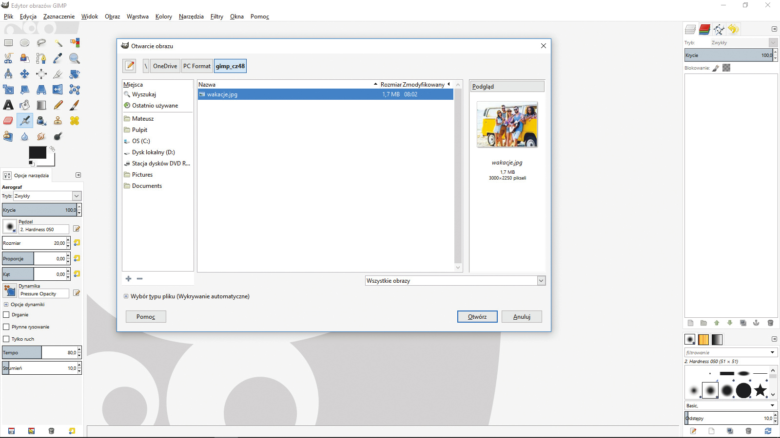 Po zainstalowaniu GIMP Instagram Effects uruchom GIMP-a i z menu Plik wybierz opcję Otwórz, a następnie w oknie Otwarcie obrazu wskaż na dysku zdjęcie, które chcesz wzbogacić efektami rodem z Instagrama, np. wakacje.jpg, i kliknij przycisk Otwórz. Zalecamy utworzenie duplikatu warstwy źródłowej.