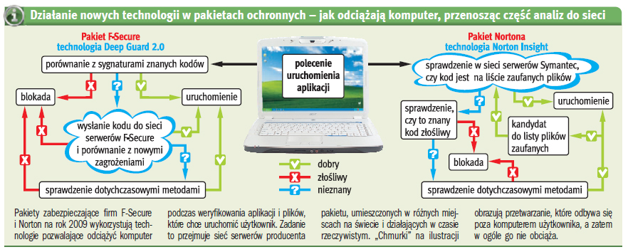 Na szczęście opracowano technologie, które odciążają komputer użytkownika, przenosząc prewencyjną ochronę w inny, ogólnoświatowy wymiar. Znamy co najmniej trzy takie rozwiązania: DeepGuard 2.0 firmy F-Secure, Norton Insight Symanteca oraz Collective Intelligence firmy Panda Security.