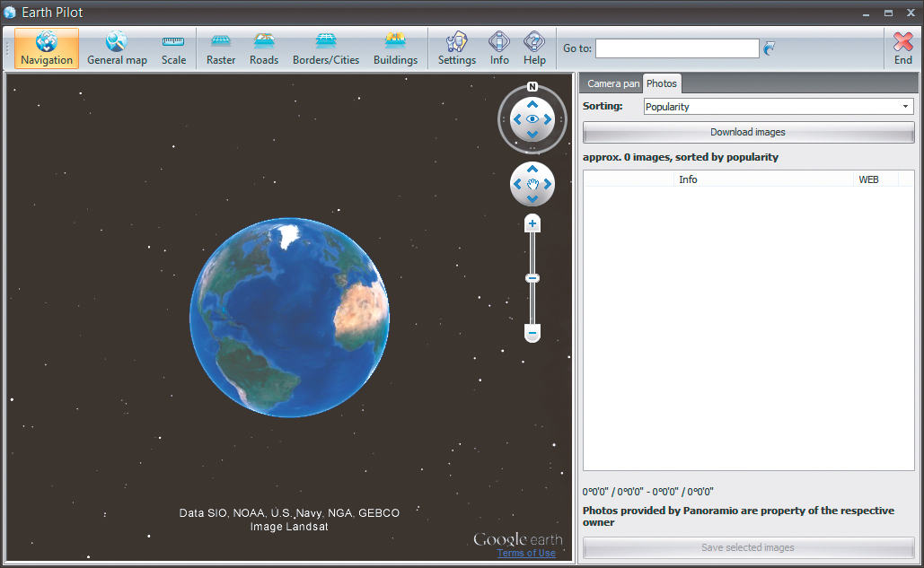 Na górnej belce programu znajdują się przyciski uruchamiające wyświetlanie różnych elementów dodatkowych. Domyślnie aktywny przycisk Navigation sprawia, że po prawej stronie globusa wyświetlany jest panel, który umożliwia zmienianie widoku, obracanie, przybliżanie i oddalanie obrazu Ziemi.