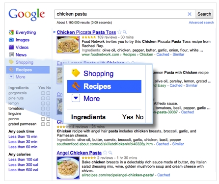 Google uruchomiło nową usługę bez większego rozgłosu. Wchodząc na stronę http://www.google.com/landing/recipes/ otrzymujemy dostęp do pola wyszukiwania, w które można wpisać zarówno listę posiadanych składników, jak i nazwę konkretnej potrawy. Wyszukiwarka zwróci nam listę dostępnych przepisów oraz umożliwi na wybór składników, których nie chcemy w swoim obiedzie czy kolacji.
