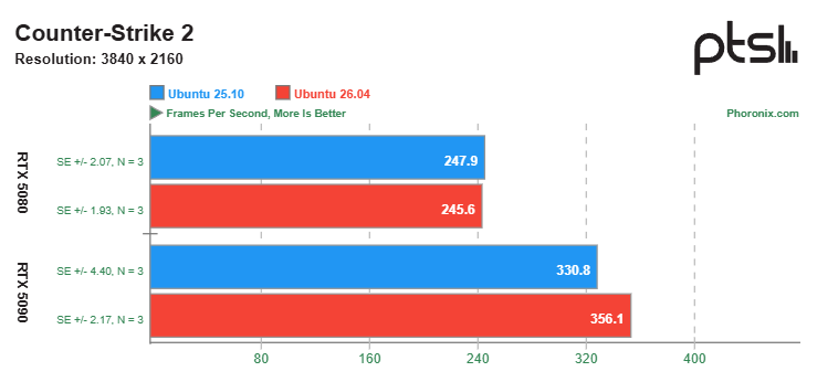 Pierwszą z uwzględnionych w porównaniu gier jest Counter-Strike 2. Ta sieciowa strzelanka uruchomiona na platformie testowej w rozdzielczości 4K wycisnęła średnio ponad 356 klatek na sekundę w przypadku Ubuntu 26.04 oraz ok. 331 klatek na Ubuntu 25.10. Różnica jest więc dostrzegalna, niemniej w przypadku RTX-a 5080 sytuacja wygląda zgoła odwrotnie. To Ubuntu 25.10 gwarantowało więcej FPS-ów (niespełna 248) niż 26.04 (ok. 245).