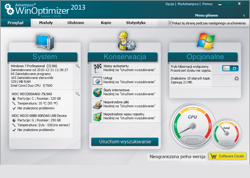 W sekcji Opcjonalne masz możliwość włączenia lub wyłączenia trybu hibernacji Windows oraz skasowania starych niepotrzebnych kopii systemu. Poniżej widoczne są „zegary” informujące o wykorzystaniu mocy procesora oraz pamięci operacyjnej.