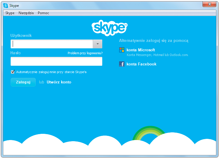 Po uruchomieniu programu Skype wyświetli się okno logowania. Wpisz nazwę użytkownika i hasło, po czym kliknij przycisk Zaloguj. Koniecznie zwróć przy tym uwagę na pole Automatycznie zaloguj mnie przy starcie Skype'a. Powinno być zaznaczone. Dzięki temu aplikacja zapamięta twoje ustawienia.