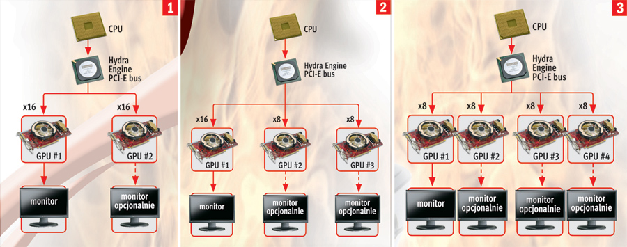 - JAK TO DZIAŁA Tak jak w SLI, sterowniki dzielą i nadzorują pracę dwóch kart, a następnie nadrzędna z nich scala obraz w całość. Pierwsza wersja CrossFire wymagała specjalnej karty (master) CrossFire Edition oraz dowolnej karty z rodziny Radeon (slave). Do komunikacji między nimi służył przewód DVI. W obecnej wersji CrossFireX nie jest potrzebna karta CrossFire Edition, a kabel DVI zastąpiono elastycznym mostkiem. Możliwe jest łączenie ze sobą trzech lub czterech kart oraz praca bezmostkowa. CrossFireX udostępnia mechanizm automatycznego podkręcenia wszystkich zainstalowanych w komputerze kart graficznych; pozwala też na połączenie możliwości karty graficznej i zintegrowanego w chipsecie rdzenia graficznego.