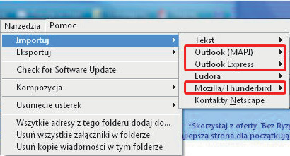 W głównym oknie programu i.Scribe wybierz z menu Narzędzia polecenie Importuj. Do wyboru masz import z kilku aplikacji, m.in. Outlook (MAPI), Outlook (Express), Mozilla/Thunderbird. Wybierz jedną z nich, np.: Mozilla/Thunderbird.