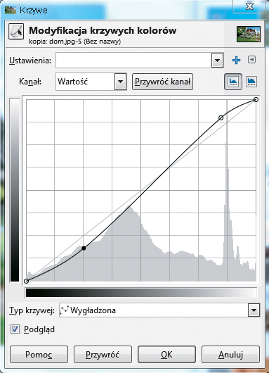 Z menu Kolory wybierz opcję Krzywe i w okienku o tej samej nazwie zmodyfikuj linię wykresu w podobny sposób, jak w naszym przykładzie. Prosta linia powinna przybrać delikatny kształt litery S. Po ustawieniu krzywej kliknij OK.