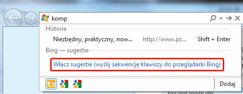 Standardowo, po instalacji Internet Explorera 9, domyślnym dostawcą wyszukiwania (czyli ustawionym w przeglądarce silnikiem wyszukiwawczym) jest Bing. W pasku adresu wpisz szukane słowo, np. „komputer”. Już po kilku pierwszych literach zobaczysz listę odsyłaczy do stron z historii skojarzonych z wpisywanym hasłem. Oprócz tego na dole listy widoczny jest odsyłacz Włącz sugestie. Kliknij go.