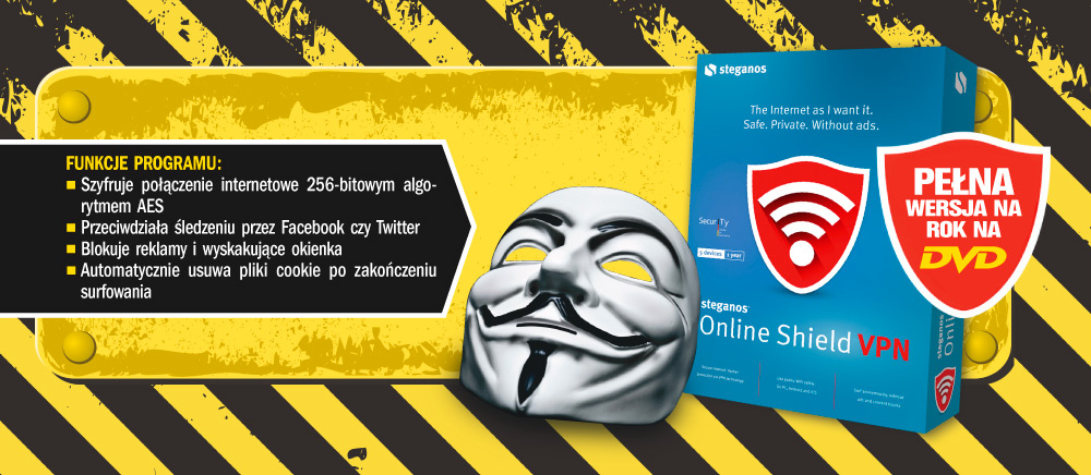 Anonimowe, bezpieczne przeglądanie stron WWW bez uciążliwych reklam jest możliwe dzięki pełnej wersji programu Online Shield VPN z naszej płyty DVD. Program chroni także przed reklamami i śledzącymi mechanizmami Facebooka czy Twittera.