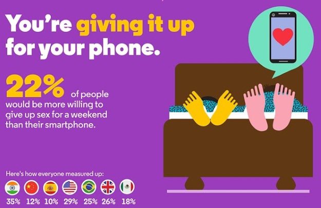 Związki z telefonem mogą być jeszcze silniejsze, dlatego 17 proc. osób przepytanych przez Motorolę bierze prysznic ze smartfonem, a dla 54 proc. jest on pierwszą rzeczą, jaką uratowaliby z pożaru mieszkania. 22 proc. wolałoby spędzić weekend bez seksu niż bez smartfona, natomiast 40 proc. pyta swój telefon o rzeczy, o które wstydziliby się zapytać przyjaciela.
