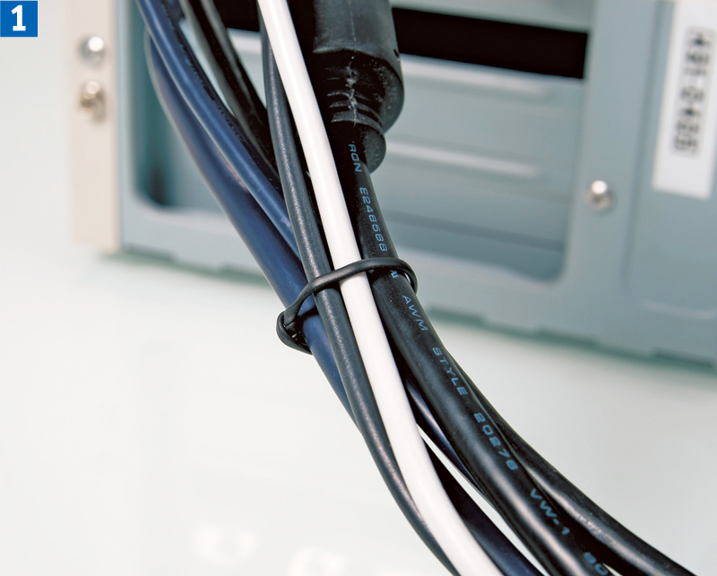Gdy plątanina kabli staje się problemem, najlepiej zacznij od nowa, a więc odłącz wszystkie kable od komputera oraz pozostałych urządzeń, odkurz sprzęt i zacznij je podłączać od zera. W miarę możliwości staraj się używać krótkich kabli, szczególnie gdy te są grube (jak zasilające i wideo). Gdy upewnisz się, że wszystko poprawnie działa, pogrupuj kable i zepnij je, używając drucianych spinek (1), opasek zaciskowych (2) lub rzepów (3).