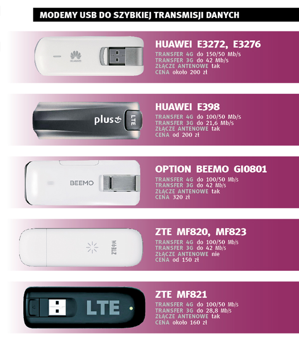 Wykorzystanie pełnej możliwości szybkiej sieci 4G jest trochę trudniejsze, bo wymaga dobrego smartfonu, specjalnego modemu lub routera, a tych jest na rynku niewiele. Oczywiście są one sprzedawane przez operatorów, jak np. popularne modemy ZTE MF821 (w Cyfrowym Polsacie) czy MF823 (w sieciach Play i Plus). Ale oprócz tego, podobnie jak w przypadku usług 3G, można kupić u operatora samą kartę SIM, a urządzenie wybrać według własnego uznania. W artykule prezentujemy kilkanaście popularnych rozwiązań.