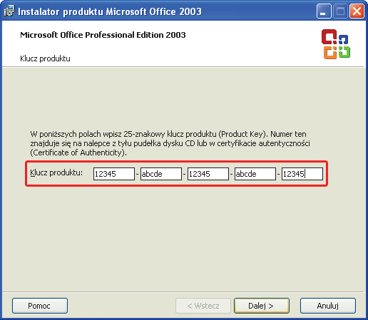 Uruchom komputer pod kontrolą Windows XP. Umieść w napędzie optycznym nośnik instalacyjny pakietu Office (w naszym przykładzie jest to wersja 2003 Professional). Jeżeli system jest skonfigurowany domyślnie, powinieneś po chwili zobaczyć ekran: Instalator produktu Microsoft Office 2003, na którym wyświetlone zostaną pola na wpisanie klucza produktu. Wpisz odpowiedni klucz i kliknij Dalej.
