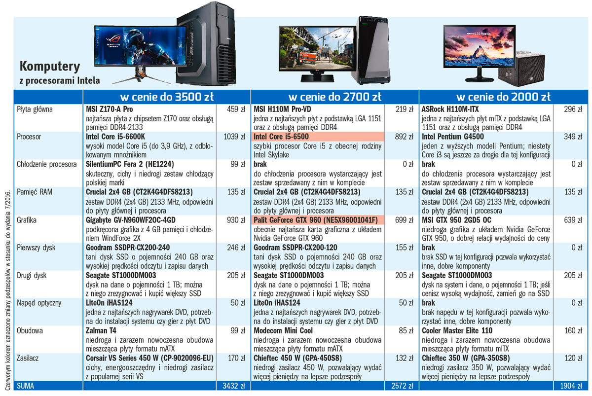 Pojawienie się nowych produktów zwykle powoduje obniżanie się cen starszych modeli. Tak więc tanieją do tej pory drogie karty z układami Nvidii i AMD (kosztujące powyżej 1000 zł), ale niestety zupełnie nie przekłada się to na ceny tańszych kart, które wykorzystujemy w proponowanych przez nas komputerach. Niektóre karty wręcz wyraźnie podrożały (być może wynika to z ich malejącej dostępności). Aby utrzymać ceny na zakładanych przez nas poziomach, konieczne były kosmetyczne zmiany w konfiguracjach.