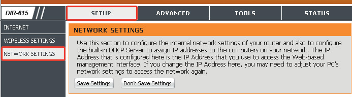 Po zalogowaniu się przejdź do sekcji SETUP, a następnie kliknij Network settings.