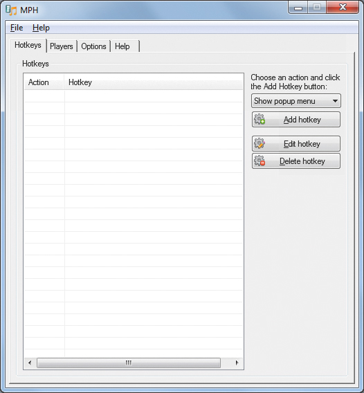Po uruchomieniu aplikacji wyświetli się okno główne z wybraną zakładką Hotkeys. Widoczna tu będzie lista funkcji i przypisanych im skrótów klawiszowych (obecnie lista jest pusta). Aby dodać nowy skrót, rozwiń listę funkcji Show popup menu.