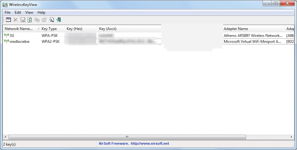 Program jest dostępny w dwóch niezależnych edycjach – dla 32-bitowych oraz 64-bitowych odmian systemu Windows. Aplikacji nie musisz instalować. Po rozpakowaniu archiwum ZIP i uruchomieniu Wireless KeyView zobaczysz w oknie Wireless KeyView wszystkie odnalezione w systemie dane sieci Wi-Fi wraz z parametrami i kluczami dostępu (kolumny Key):